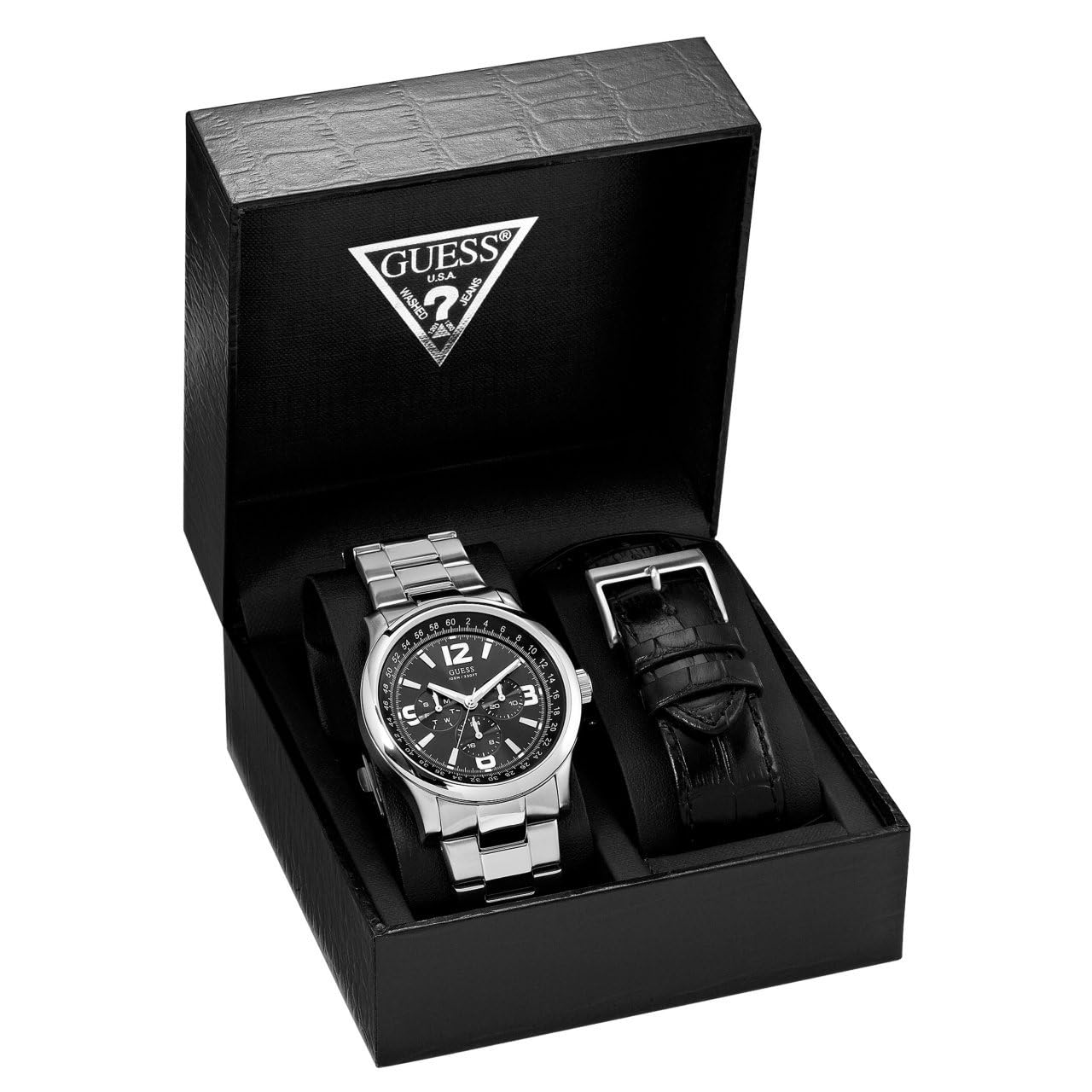 Multifunction: Day, Date, 24 Hour/Intl. time Dimensions in mm: 45/45/12.5 Brushed Silver-tone case w/ Polished Silver-tone Top Ring case Black dial Steel bracelet and black croco-grain leather strap 100 M/330 FT 10 Year Limited Warranty Men's Accessories > Watches > Guess Watches